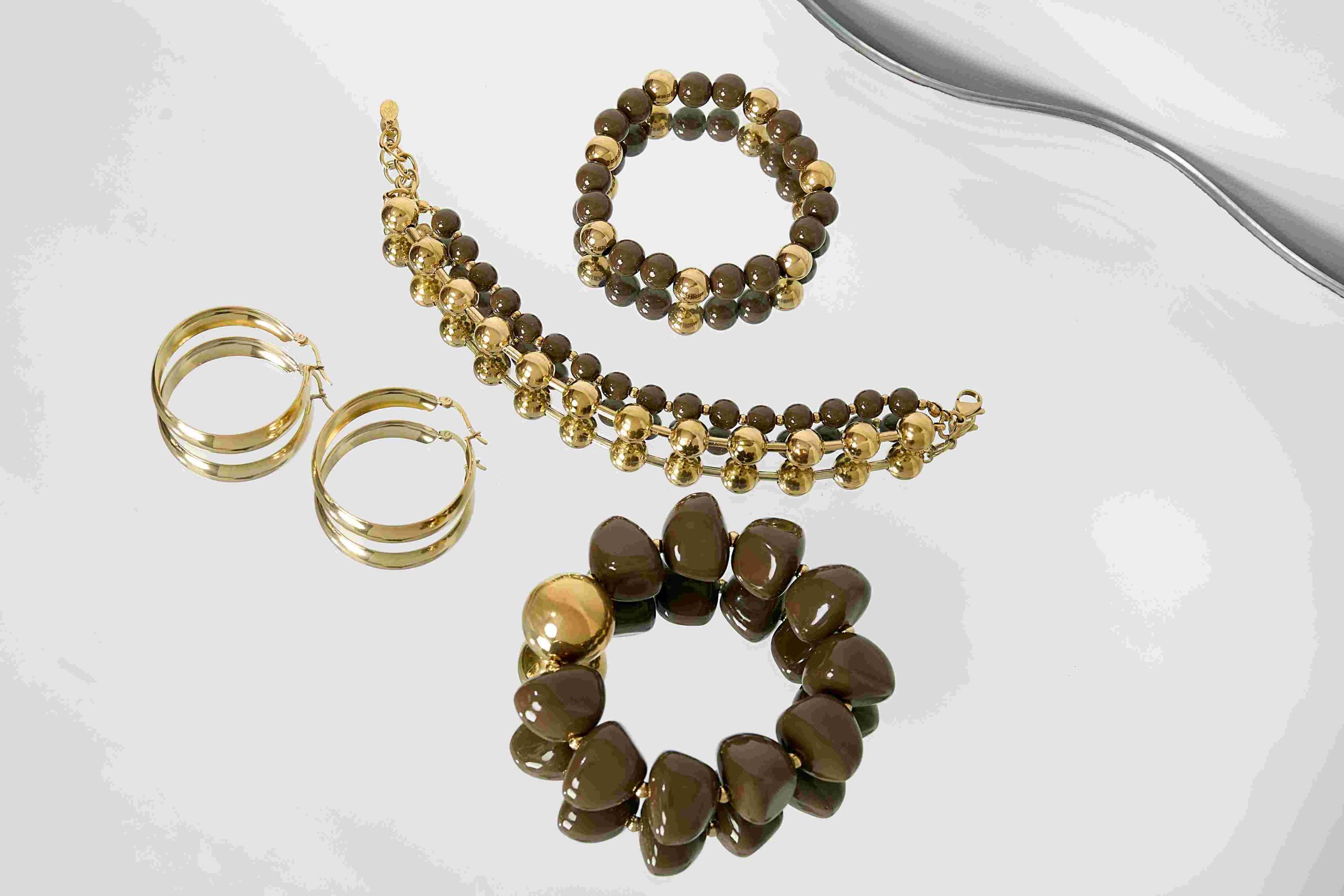 A: We offer stainless steel and gold-plated earrings, bracelets, rings, and necklaces, all curated into themed or bestseller display sets for immediate merchandising use.