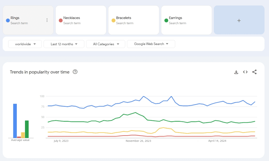 Data from Google Trends confirms this, showing that rings are the most searched jewelry-related topic on Google.