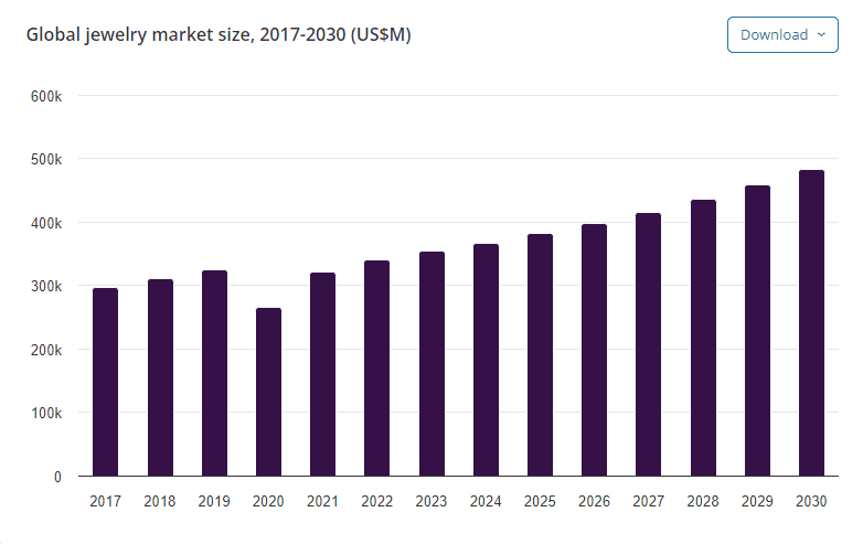 The jewelry market is a large and continuously growing market. According to market research company Grand View Research, the global jewelry market was valued at $353.26 billion in 2023, with a projected compound annual growth rate (CAGR) of 4.7% from 2024 to 2030. This indicates a broad development prospect and significant profit potential in the jewelry market.