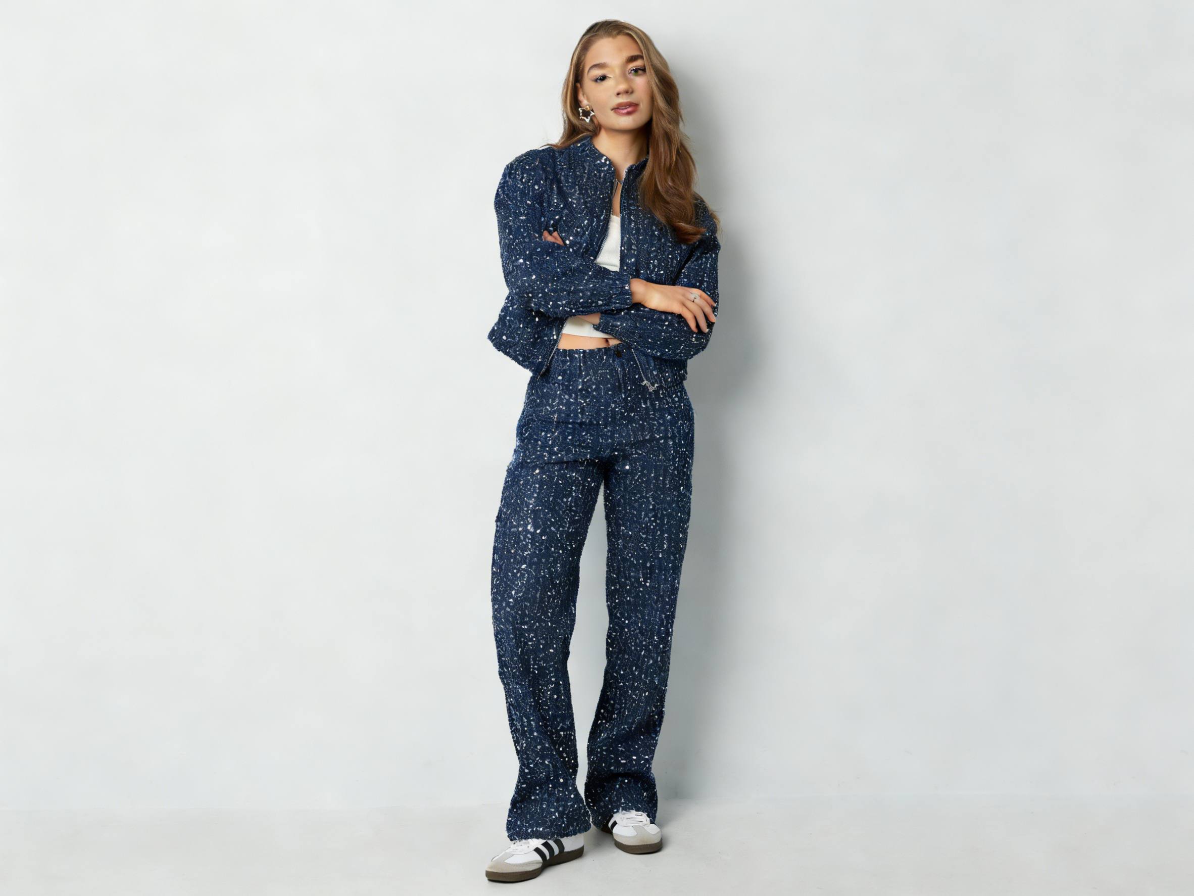 Glitter jeans make a daring but flexible pick for Valentine’s outfits. Their built-in shine brings holiday fun. This suits them for evening outings, friend meetups, or shop front setups. Common colors include blue and light blue. These shades fit the loving vibe of the time.